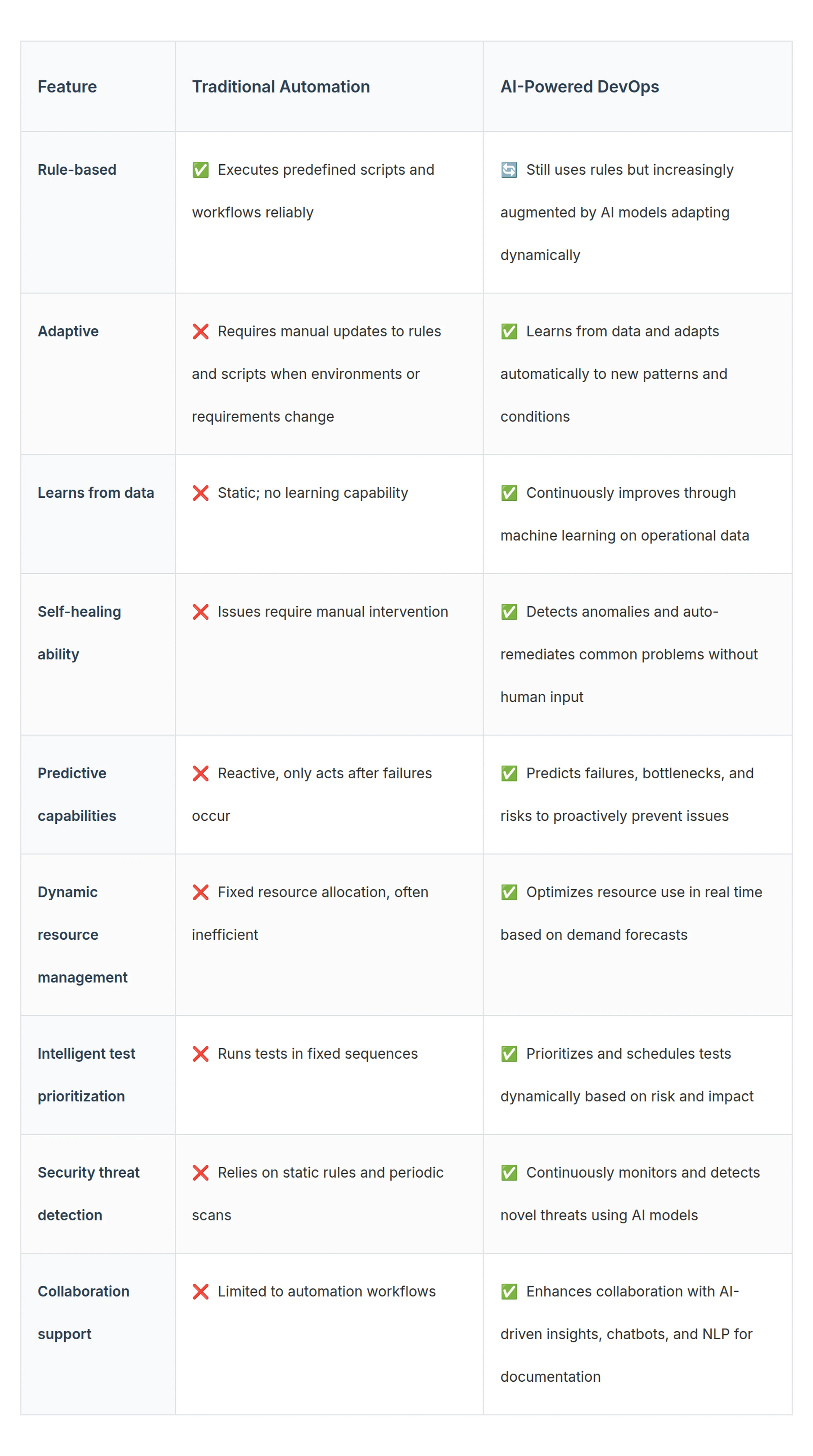 When comparing traditional automation with AI-powered DevOps, the differences highlight how AI fundamentally enhances and evolves DevOps practices beyond rule-based scripting.