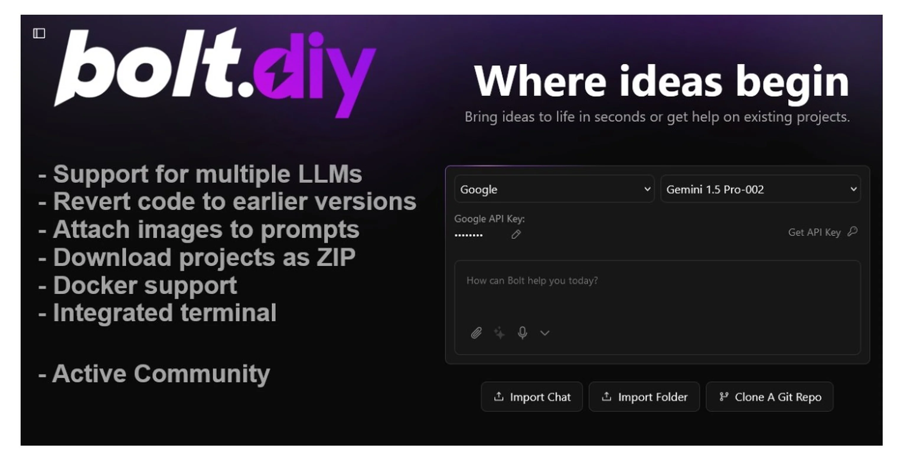 Then we found out about an open-source project bolt.diy - an open source fork of bolt.new that handles all the project generation, GitHub integration, chat, attachments, AI completion, and more - It was just what we needed!