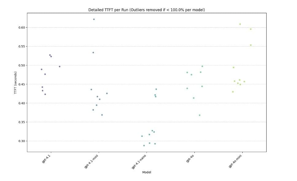 TTFT comparison per model (Outliers removed to mitigate API overhead impact)