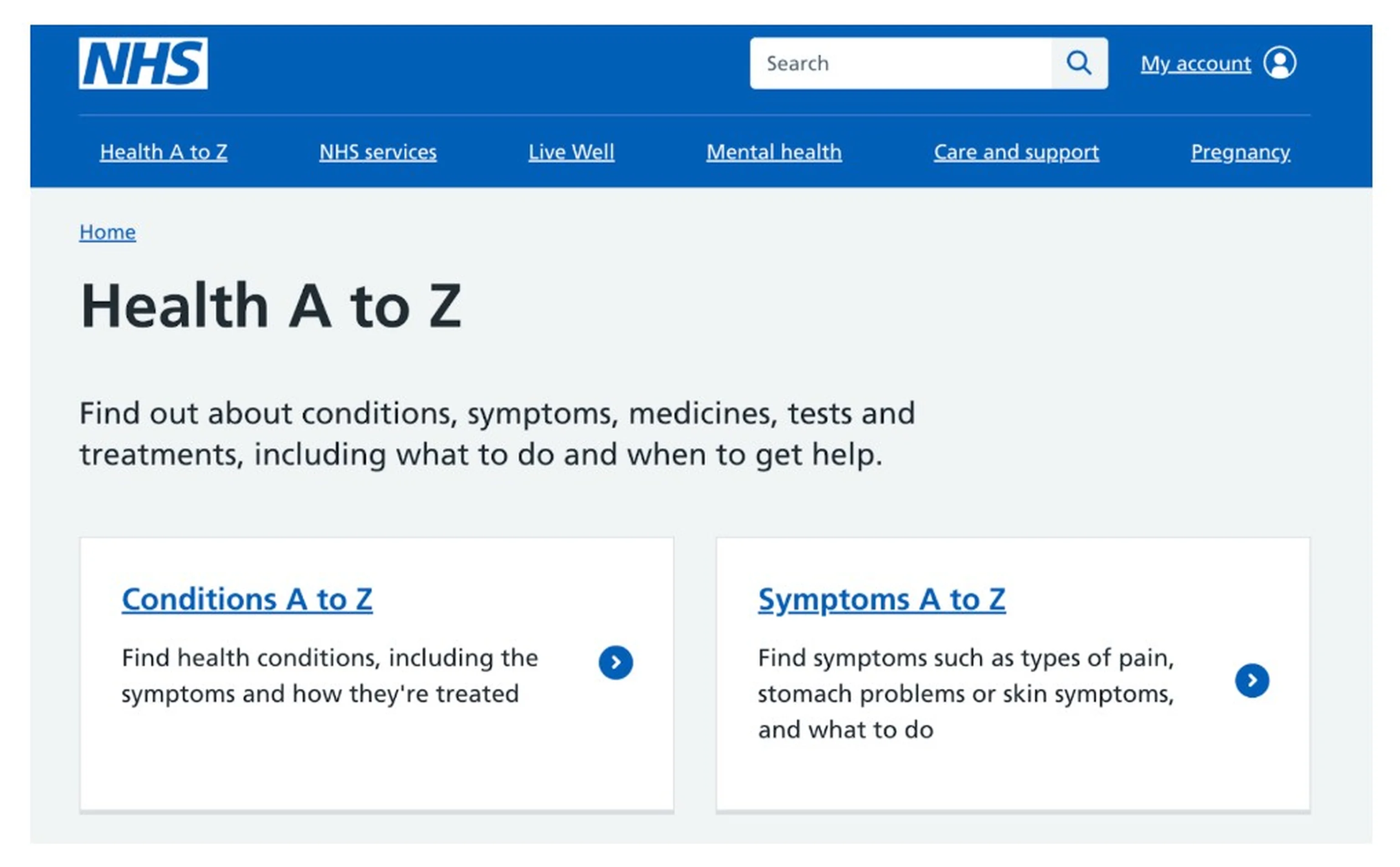The NHS (UK National Health Service) website is a strong example of a clear, predictable structure designed for moments when users are stressed, anxious, or in a hurry. Its pages use plain, everyday language (“Check symptoms,” “Get help now”), a consistent navigation pattern across all sections, and simplified page layouts with clear headings, short paragraphs, and scannable bullet points. Condition pages follow the same template, so once users understand one, they intuitively understand them all. This reduces cognitive load for users with cognitive disabilities, low health literacy, or limited English, and equally benefits anyone trying to find reliable health information quickly on a small screen or in a moment of urgency.