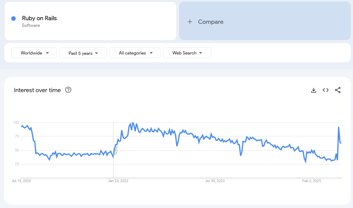 The Google Trends chart for Ruby on Rails might not scream “constant growth”. But it shows relatively stable interest in the framework, with a significant uptick in 2025.