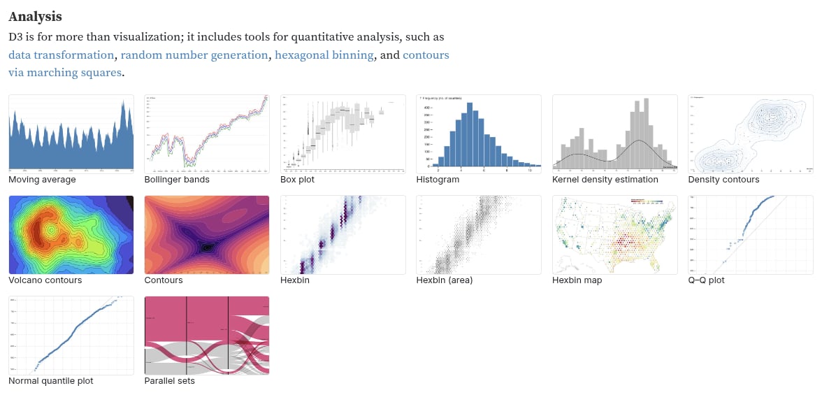 D3 is one of the most popular JS libraries not just for data visualization, but also animations, data analysis, geo, and data utilities. It uses HTML, SVG, and CSS. Now maintained by Observable, D3 positions itself as "the JavaScript library for bespoke data visualization," emphasizing maximum flexibility for custom, data-driven graphics.