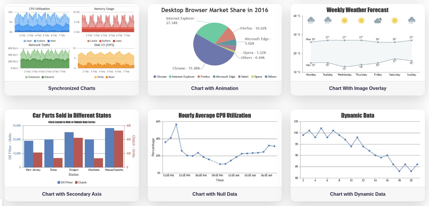 amCharts 5 is remarkably fast to implement - developers report getting proof-of-concept dashboards with multiple charts running in under 5 minutes. The library includes comprehensive chart types (bar, line, pie, heatmaps, Sankey, treemaps) plus geographical maps.