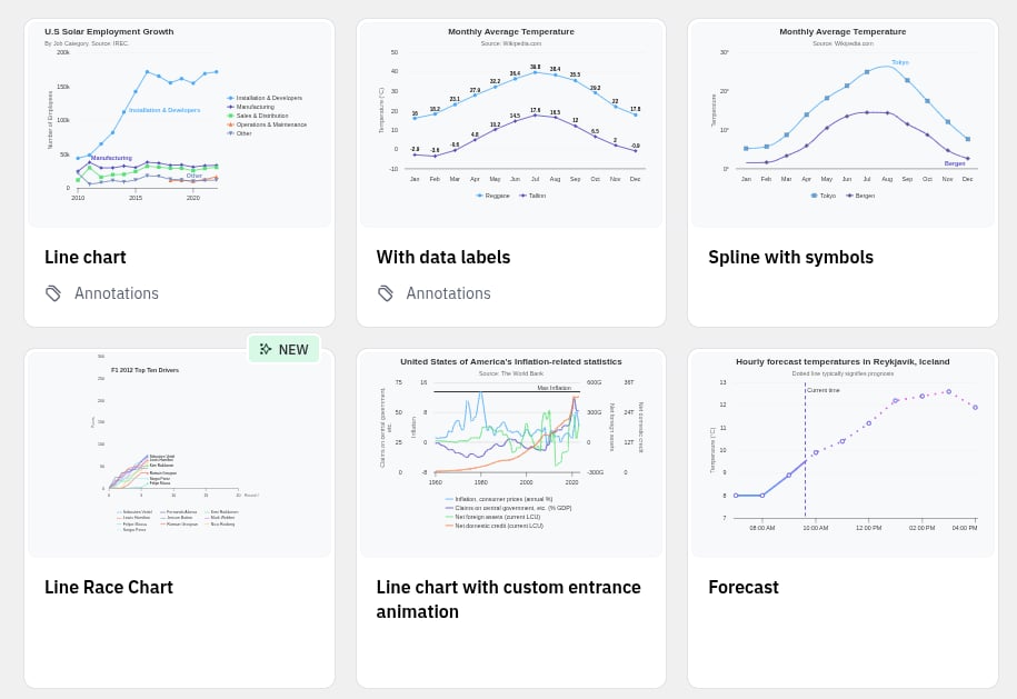 Highcharts excels at ease of use with smooth learning curves, extensive documentation, and a WYSIWYG chart editor for non-developers. The WebGL-powered boost module handles millions of data points efficiently. Recent additions include Highcharts GPT for creating visualizations with natural language prompts and improved React integration.