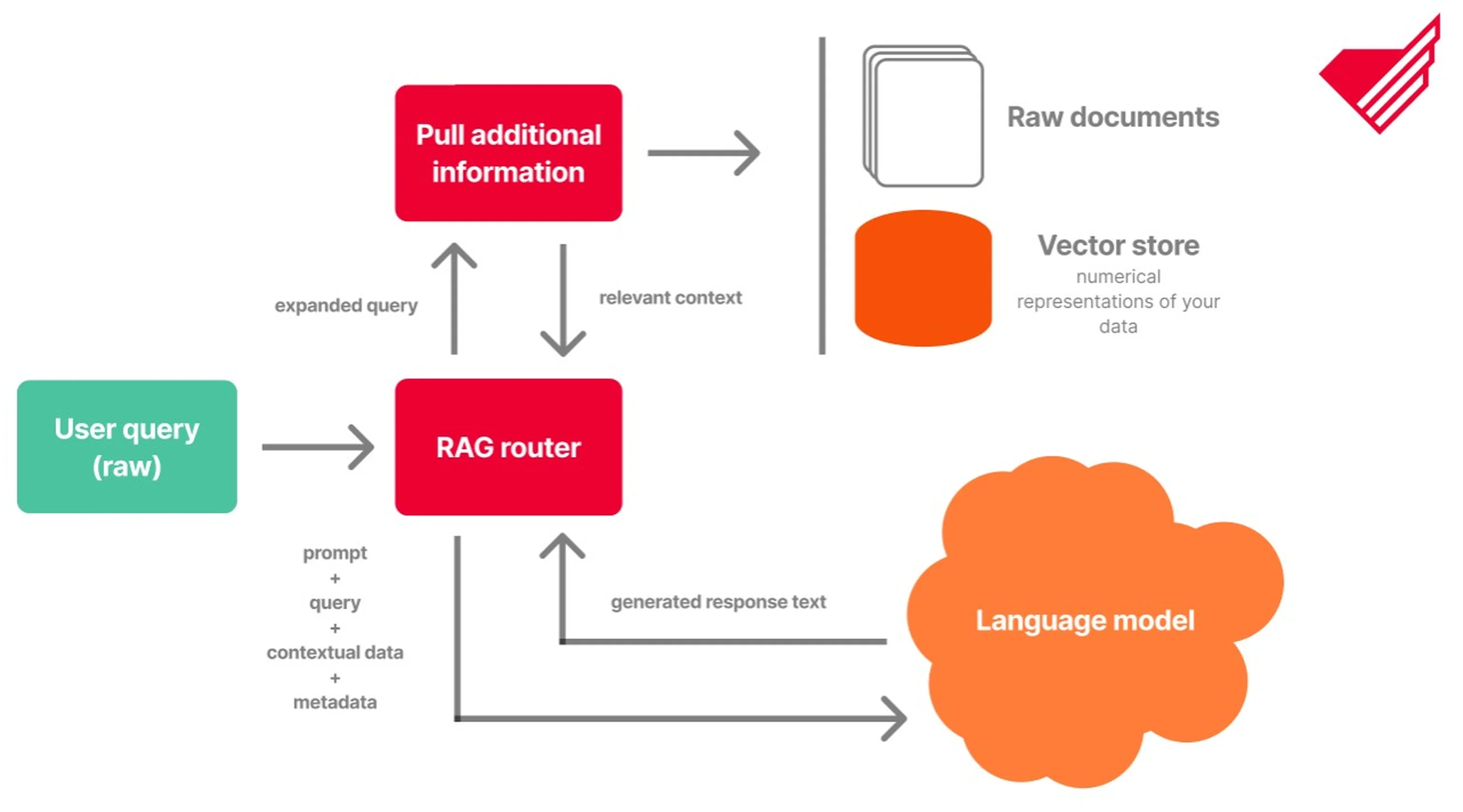 Retriever – The retriever searches for relevant information. This is mostly powered by vector search in a vector store (e.g., Pinecone, Qdrant, Weaviate) or through keyword-based search. The retriever uses embeddings to capture semantic meaning, enabling semantic search rather than simple keyword matching. Other than vector searching methods are more than welcome here, as searching lexically and parameter filtering are also common practices among more mature RAG systems.