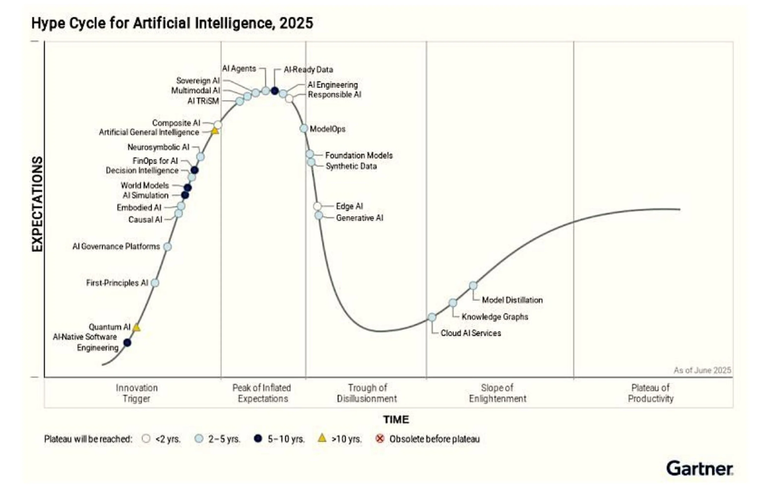 Gartner’s 2025 AI Hype Cycle makes this divergence explicit.